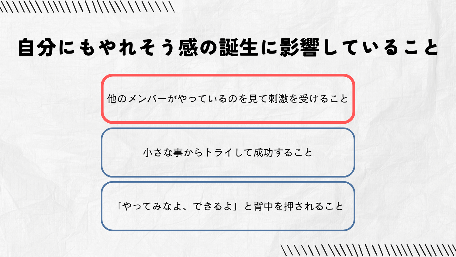 私たちは、メンバーが自発的に動くカギとなる"自分にもやれそう"という感覚が大切だと考えています。この「やれそう感」が、メンバーにとっても最初の行動の第一歩を踏み出す大きな原動力になります。